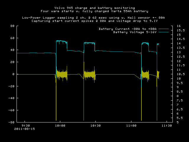 Logging car battery current and voltage. Recording 80A transients.